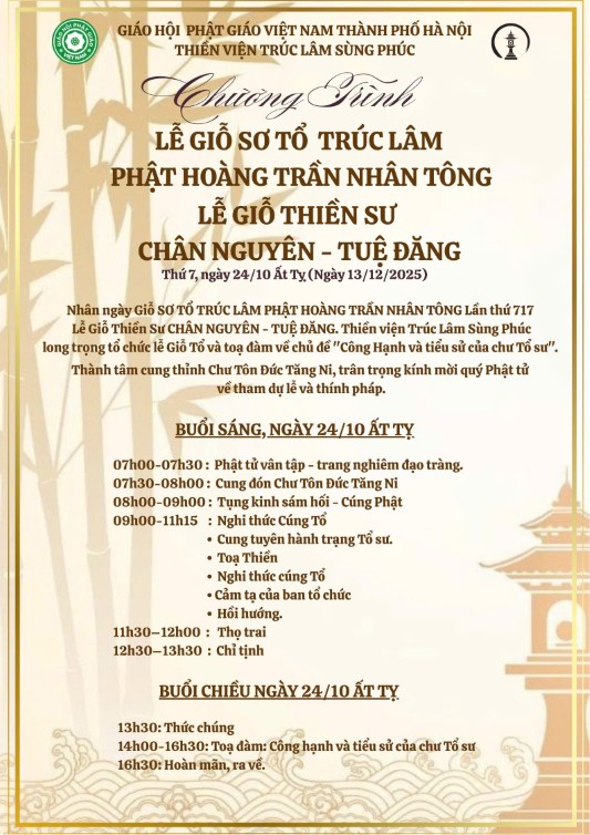 Nhân Ngày Giỗ Sơ Tổ Trúc Lâm Phật Hoàng Trần Nhân Tông lần thứ 717, Lễ Giỗ Thiền Sư Chân Nguyên - Tuệ Đăng, TVTL Sùng Phúc long trọng tổ chức Lễ Giỗ Tổ và tọa đàm với chủ đề " Công Hạnh và Tiểu Sử Của Chư Tổ Sư" vào ngày 24 tháng 10 năm Ất Tỵ ( 13/12/2025).