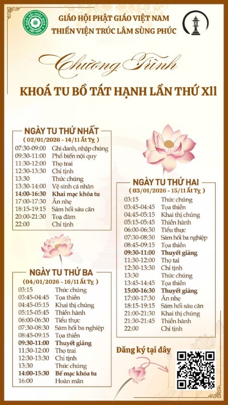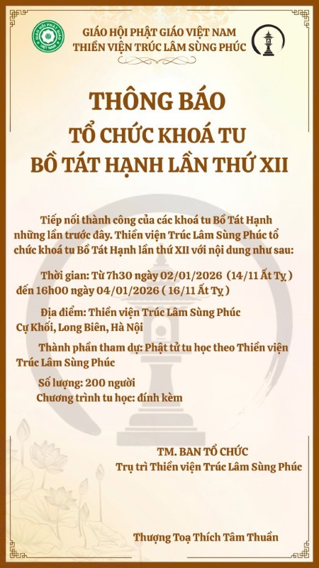 Tiếp nối thành công của các Khóa Tu Bồ Tát Hạnh trong những lần trước đây, Thiền Viện Trúc Lâm Sùng Phúc long trọng tổ chức Khóa Tu Bồ Tát Hạnh lần thứ XII với nội dung như sau: